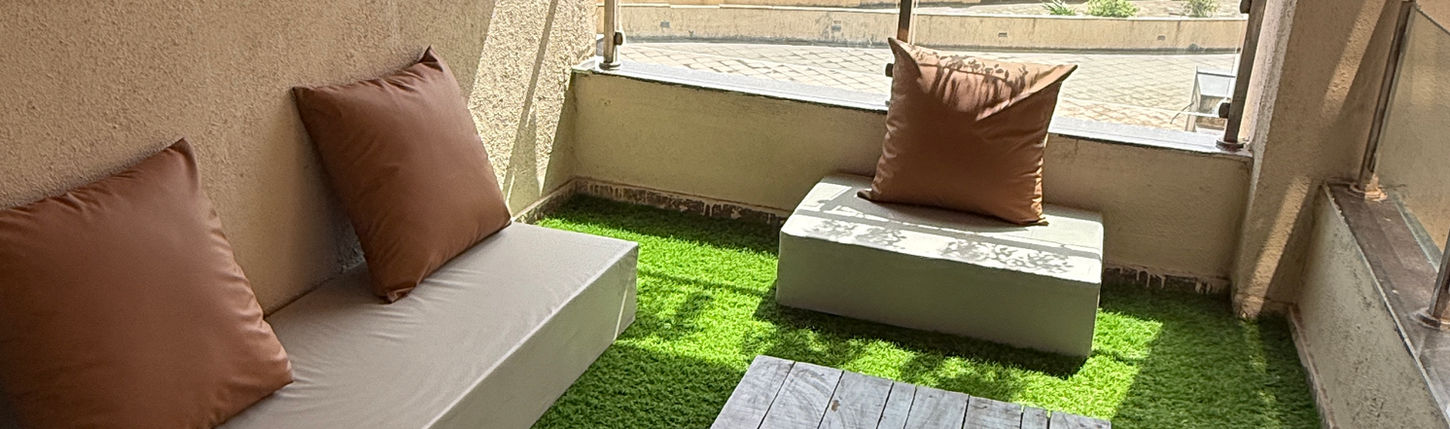 Living Room with sofa seating of 5-6 people, attached garden balcony with seating of 5-6 people & 43inch Smart Led.