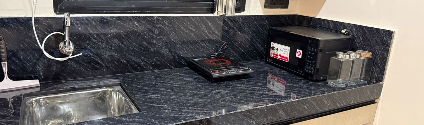 * Equipped with **mini fridge**, **microwave**, **induction cooktop**, basic cookware, and cutlery
